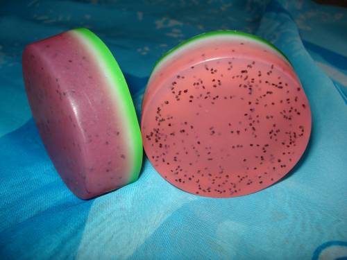 Состав:мыльная основа, масло зародышей пшеницы, масло персиковых косточек, витамин А, Е, отдушка, глицерин, диоксид титана, семена мака, краситель пищевой.